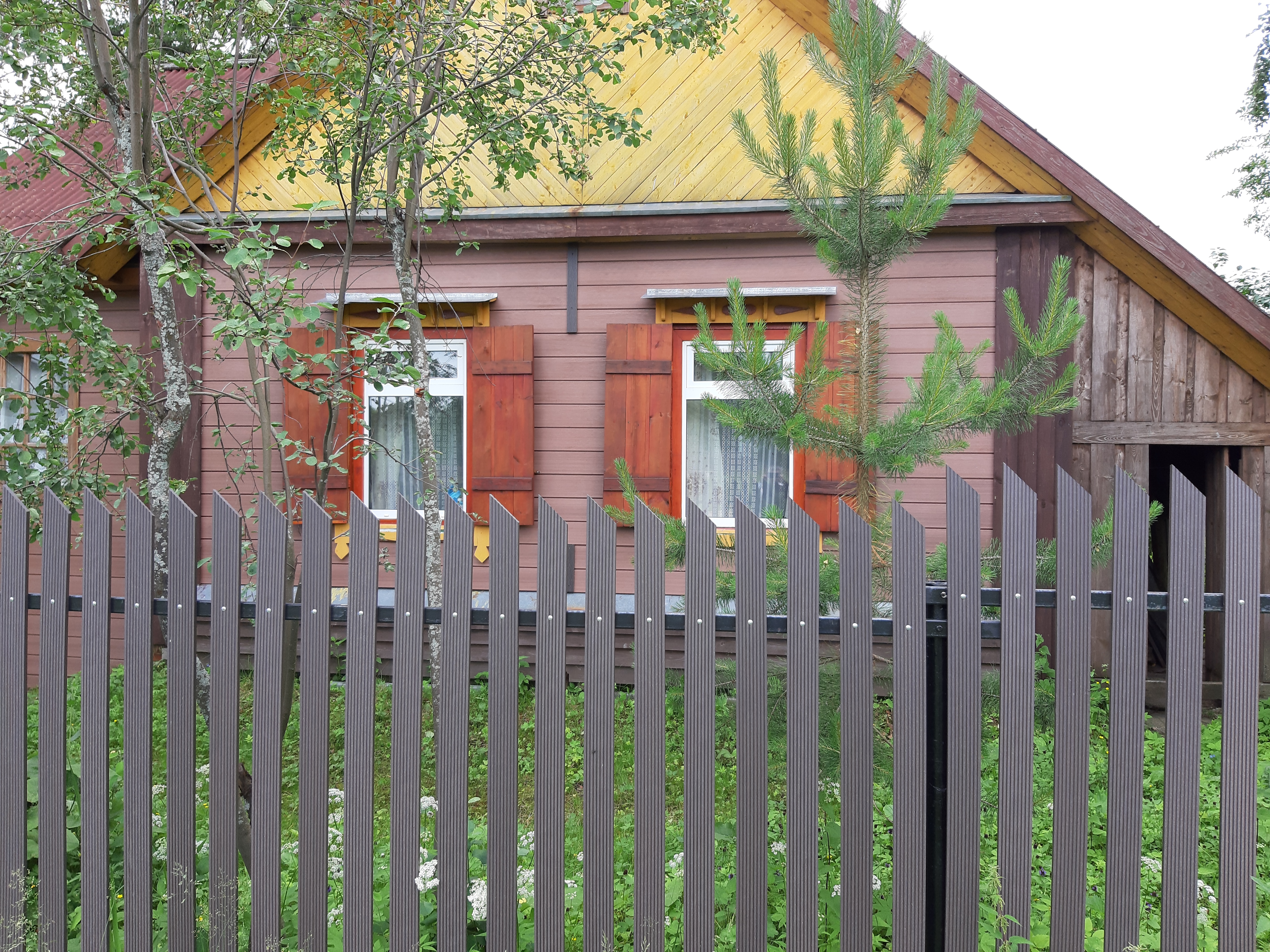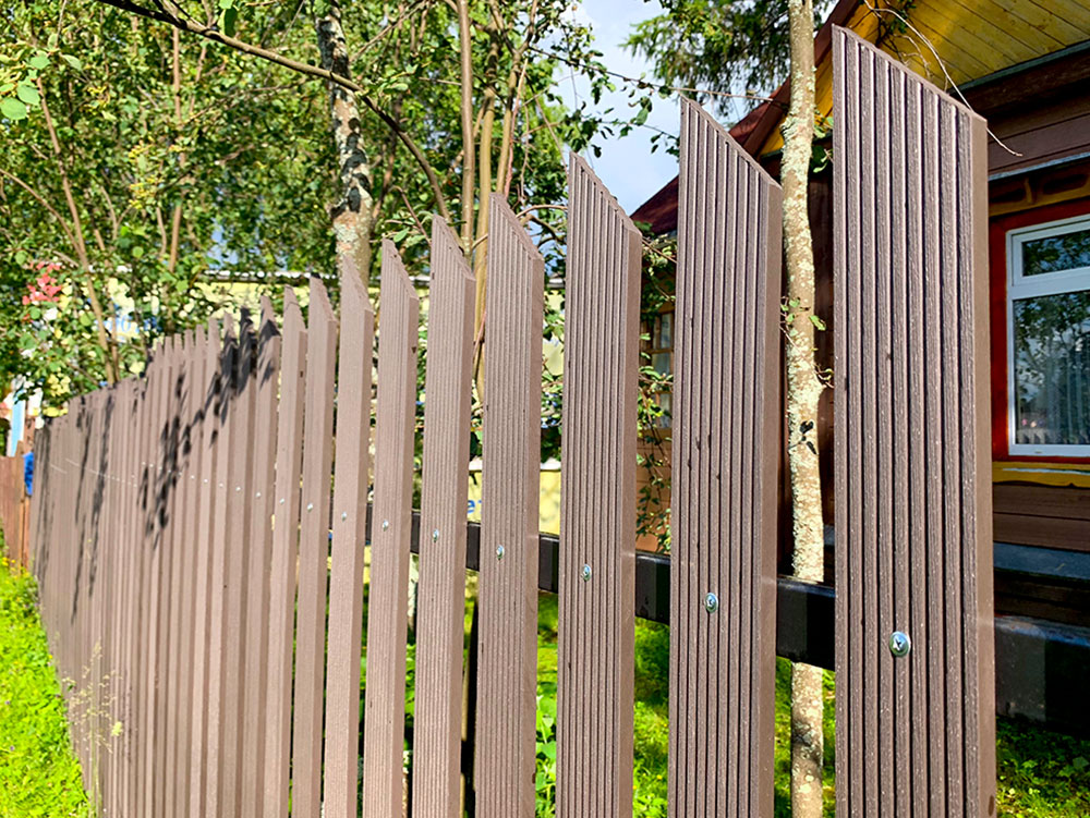 Для реализации этого проекта, нам понадобился специальный узкий полнотелый штакетник из ДПК. Ведь у владельца не так много времени посещать дачу и постоянно поддерживать деревянный штакетник в идеальной форме. Для ДПК-же такой уход не требуется и достаточно просто использовать по мере необходимости специальное средство для очистки ДПК и средство для защиты декинга. И он прослужит вам долгие годы не потребовав ничего дополнительно.